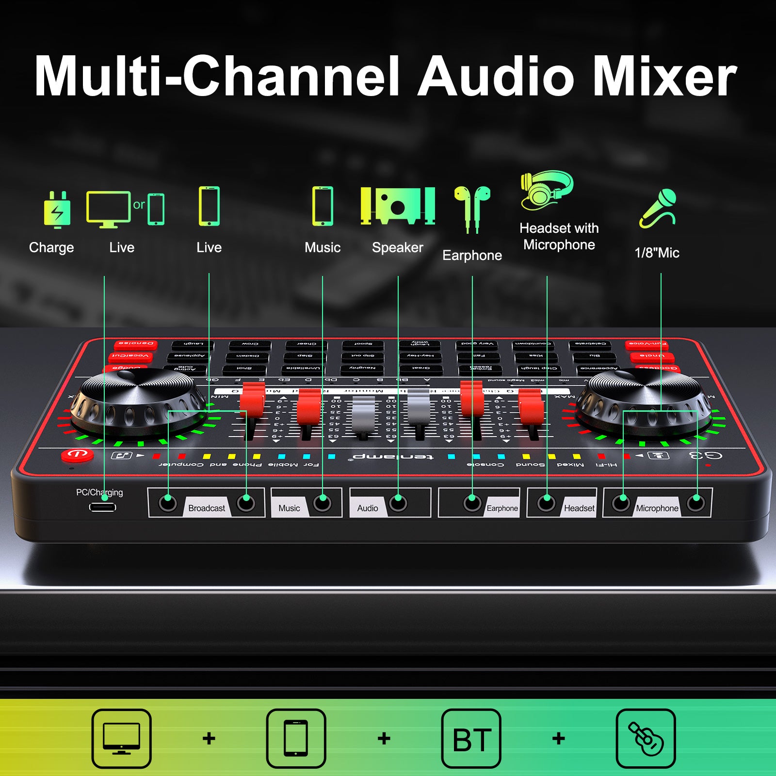 - 【Podcast Equipment Bundle】The podcast microphone bundle includes everything you need for professional-quality audio creation: a 3.5mm condenser microphone with Round Base Stand and the Sound Board. Perfect for podcasters, gamers, streamers, and content creators who want an all-in-one solution for mixing, recording, and streaming.